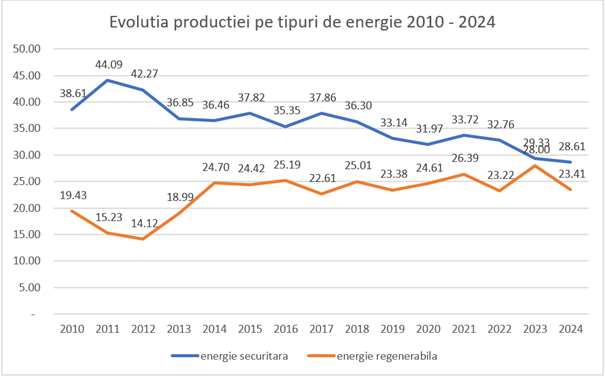 Fig. 4 – Evolutia producției de energie electrică pe tipuri – securitară – regenerabilă între 2010 – 2024