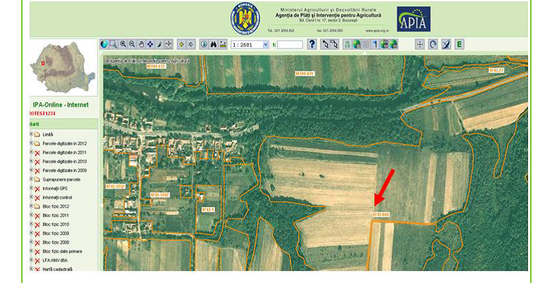 3. APIA dispune de un soft performant, la carea ai acces pe baza de username si parola, oriunde, oricand. Poti sa vezi blocul fizic din care face parte parcela ta (sau suma de parcele care formeaza o anumita cultura) , putand adesea se identifici parcela (sau suma de parcele comasate) pe care o lucrezi in mod real dupa fotografie (culoare, vecinatati, relief). Poti sa o masori dar nu stii daca amplasamentul este corect (acesta fiind definit de parcelar), pentru ca nu exista o optiune de afisare a hartii parcelare suprapusa peste cea satelitara.