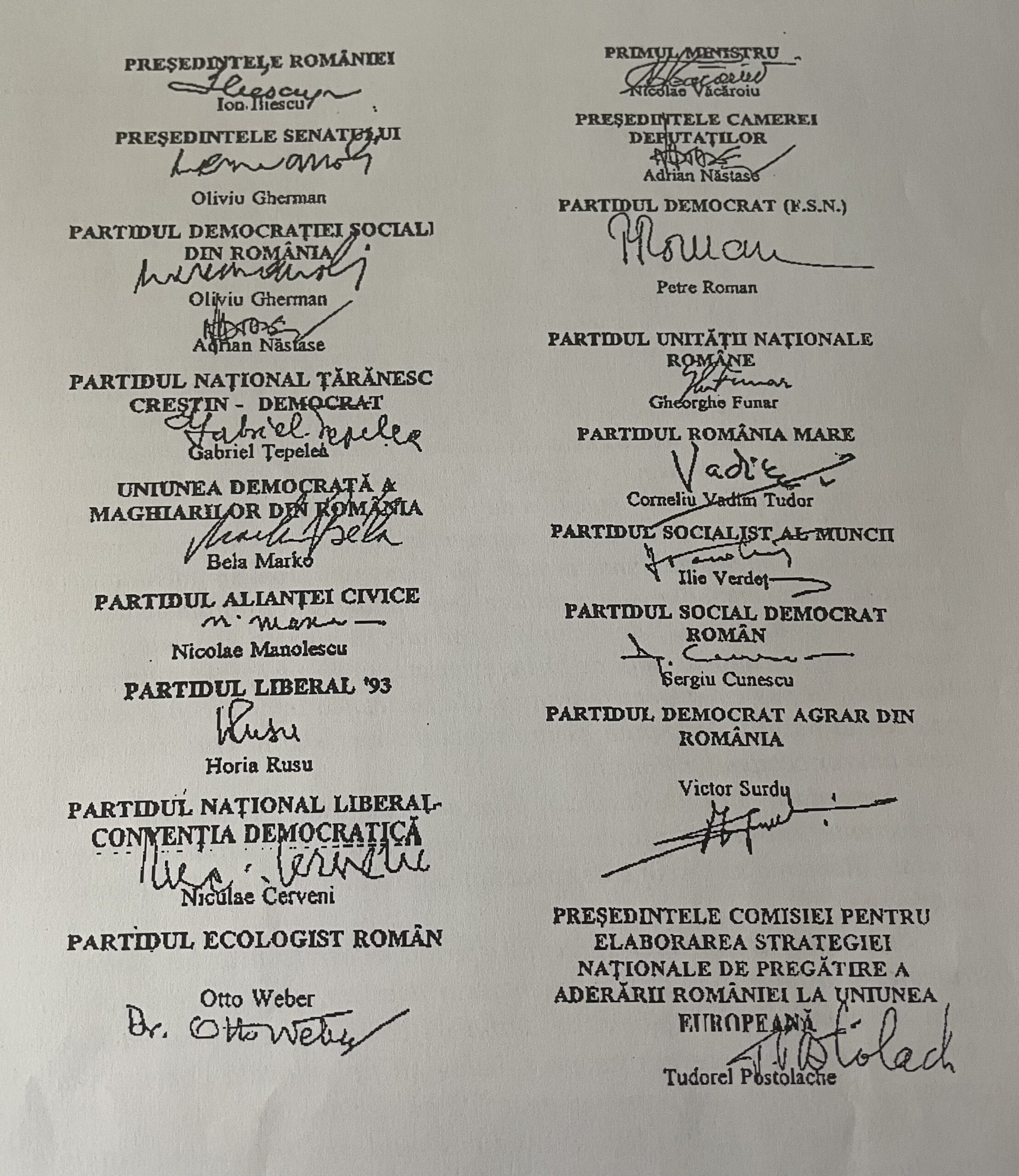 De asemene, criteriile de aderare, stabilite la Copenhaga (1993) cereau ca fiecare țară să-și asume obligații privind existența unor instituții democratice stabile, a unei economii de piață funcționale și să demonstreze capacitatea de a-și asuma obligațiile după aderare. Deci, era un lucru fundamental ca „patrulaterul roșu” de la guvernare (PDSR, Partidul România Mare, Partidul Unității Naționale și Partidul Socialist al Muncii) să își asocieze numele partidelor de opoziție, ce aveau sprijinul explicit al Occidentului și o opțiune clară pentru integrarea euroatlantică. Din surse PNŢ-CD, am aflat că „Seniorul” Corneliu Coposu, liderul de facto al Opoziției, s-a simțit șantajat și, de aceea, l-a trimis la Snagov pe Gabriel Țepelea să semneze Declarația în numele PNŢ-CD, pentru a nu fi acuzat că se opune integrării în UE.