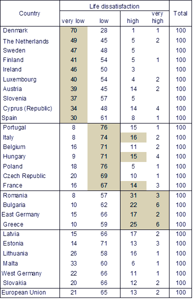 Media celor nemulțumiți de viața proprie, în EU, era de 13%. La nivel de țară, pentru România, procentul maxim corespunzător de nemulțumiți era de 31%, în cazul românilor. În aceeași grupă de maximă nemulțumire sunt și bulgarii, grecii și est-germanii. Altfel spus, nemulțumirea maximă era concentrată în sudul EU și în foste țări comuniste. Satisfacția cu viața este concentrată în nordul EU, în special în Danemarca, Suedia, Finlanda și Irlanda.