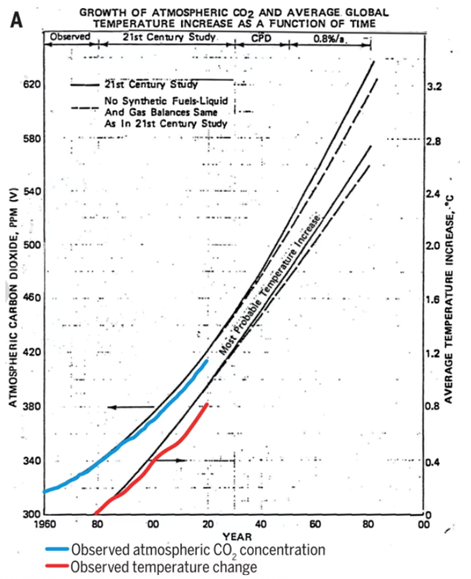 Sunt toți climatologii comuniști? Oare ce să zicem atunci despre oamenii de știință angajați de conglomeratul gigant de combustibili fosili Exxon Mobil, care au prezis, încă din anii ’70, cu o acuratețe neverosimilă, rata de încălzire globală cauzată de arderea antropogenă a acestor combustibili (Img. 1)? Erau ei comuniști? A fost acesta oare motivul pentru care conglomeratul capitalist Exxon s-a decis nu numai să nu publice aceste predicții îngrijătoare, ci s-a angajat într-o campanie de discreditare a științei climatului? Să fim serioși. Motivele sunt cât se poate de evidente. Le găsim identificate deja în Biblie, de exemplu în Luca 1:15 sau 1 Timotei 6:10.