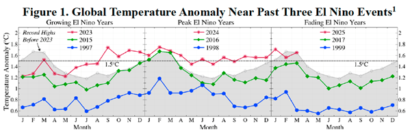 Cele trei linii, albastră, verde, roșie, urmăresc încălzirea globală în contextul ultimelor trei manifestări de El Niño, 1997-1999, 2015-2017, 2023-2025. Două lucruri sunt evidente: (1) fiecare El Niño se petrece în contextul unei temperaturi globale mai ridicate decât cel anterior; (2) ultimul El Niño nu a condus la o micșorare a temperaturii globale după ce el s-a terminat. Este oare posibil că am ratat, ca specie, șansa să ne menținem încălzirea climatului la o limită tolerabilă de sub 1,5° C, și că ne îndreptăm deja spre o încălzire globală de 2° C, cu consecințe greu de prezis, dar cu siguranță nefaste? Se pare că da. Ba chiar mai mult, există analize care prezic că de fapt ne îndreptăm spre o încălzire încă și mai mare, până la 3,4° C.[24]