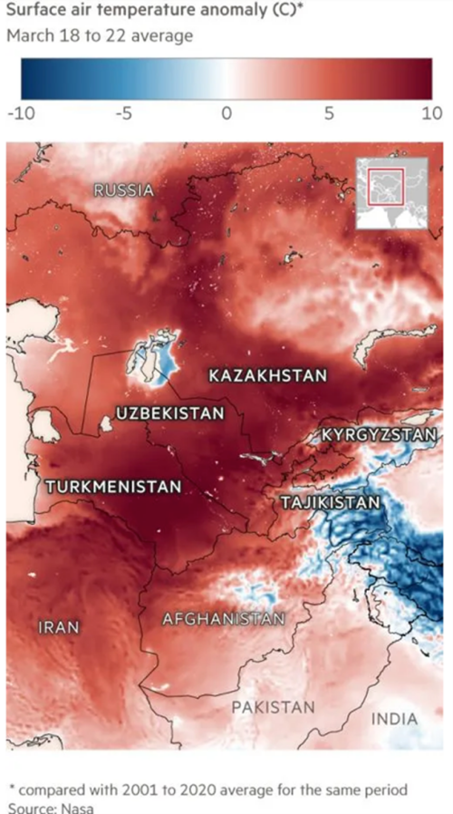 Dar atunci ce facem cu Financial Times, care menține un newsletter săptămânal numit „FT Climate Capital”? Specializat pe reportaje despre sectorul economic-financiar, este totuși un ziar get-beget capitalist, auto-identificându-se drept conservativ-liberal. În newsletter-ul de pe 6 aprilie este analizat valul de căldură din Asia Centrală din martie anul curent, când în Uzbekistan, Turkmenistan, Tadjikistan și Kârgâzstan au fost măsurate temperaturi cu 10° C (!) mai mari decât în perioada pre-industrială (Img. 3). Financial Times conchide: Cercetători de la grupul World Weather Attribution (WWA) „afirmă că evenimentul ar fi fost ‚esențial imposibil’ fără schimbările climatice […]. Schimbările climatice au făcut ca acest val de căldură ‚demențial’ să fie cu în jur de 4° C mai intens și de aproximativ trei ori mai probabil. Ei au semnalat că aceste cifre sunt cel mai probabil estimări conservatoare”[28]. Citez titlurile altor recente newsletter FT: „Ghețarii se micșorează tot mai repede din 2000 încoace”, “Gheața de mare se topește într-un ritm alarmant”, „Cum se intensifică inundațiile din Europa”, etc.