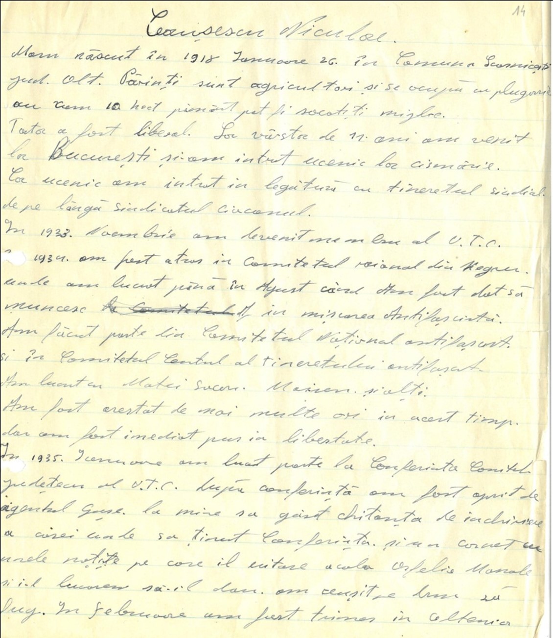 Mam născut în 1918 Ianuoare 26 în Comuna Scorniceşti jud. Olt. Părinţii sunt agricultori şi se ocupă cu plugărie au cam 10 hect pământ pot fi socotiţi mijloc.