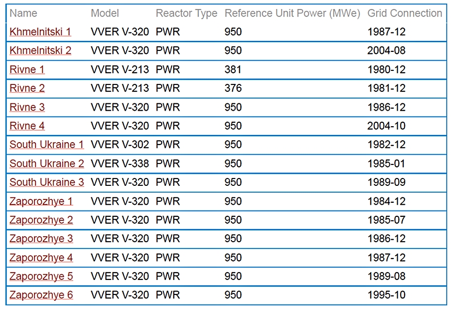 Reactoare nucleare în Ucraina (model, tip, capacitate instalată, an PIF)