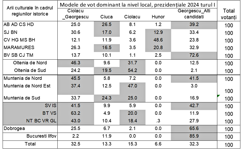 - Au existat cel puțin cinci modele de vot social, multe dintre ele cu localizare comunitar-regională specifică sau combinate în cadrul aceluiași loc. Le-am putea denumi, prin candidații susținuți de populație în turul I al prezidențialelor din decembrie 2024: Ciolacu-Georgescu, Ciucă, Ciolacu, Hunor, Georgescu-alți candidați (Tabelul 1). Tipul de vot Ciolacu-Georgescu îl regăsim în special în ariile culturale ale Moldovei, în nordul Munteniei și în nordul Olteniei. Modelul de vot Georgescu și alții este localizat în special în Dobrogea, București-Ilfov, și în Transilvania marilor orașe. Modelul Ciolacu este specific Olteniei, Munteniei de Nord-Est, Munteniei de Sud, ariilor culturale ale Moldovei (în afară de Suceava-Iași).