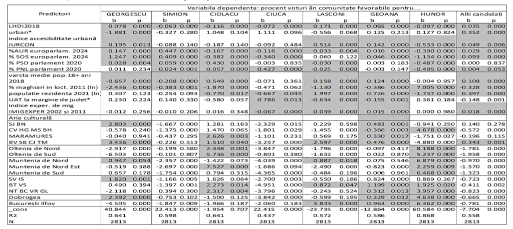 Analizele la nivel de comunitate locală le-am realizat prin regresie multivariată (nu multiplă), cu opt variabile dependente referitoare la ponderea votanților la prezidențialele din 24 noiembrie 2024. Rezultatele acestei analize sunt sintetizate în tabelul A1 din anexă. Acestea au caracter tehnic și sunt destinate celor care au și interese statistice în lectură.
