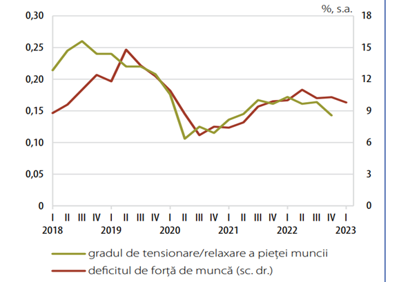 După cum se observă din graficele de mai sus, rata anuală a inflației (indicele prețurilor de consum) a atins nivelul de 16,76% în noiembrie 2022, după care a început să scadă ușor, ajungând la 14,53% în martie 2023. Rata anuală de creștere a salariului mediu brut pe economie s-a mărit în perioada ianuarie-februarie 2023, ajungând la 13,1% față de 11,7%, respectiv 12,2% la sută în ultimele două trimestre din 2022. Această creștere a fost determinată de evoluțiile din sectorul privat (15,7% în primele două luni din 2023), ca urmare a deciziei autorităților de majorare a salariului minim brut (cca. 33% în construcții, respectiv aproape 18% în celelalte sectoare economice), ceea ce a constituit o formă de ajustare implicită a unor salarii cu rata inflației. Accelerarea creșterii salariilor se explică, de asemenea, prin anticipațiile inflaționiste (fig. nr. 2 și fig. 4), în timp ce productivitatea muncii și gradul de tensionare a pieței muncii au avut contribuții neglijabile la dinamica salarială (fig. nr. 2). În sectorul public, ritmul de creștere a salariului s-a menținut moderat, înregistrându-se însă o augmentare de 5% în perioada ianuarie-februarie 2023 (de la 3,7% în ultimul trimestru al anului anterior), ca urmare a unor majorări salariale în administrația publică și în învățământ. Rămâne de văzut ce consecințe va avea recenta ordonanță de urgență a guvernului pentru creșterea salariilor profesorilor.