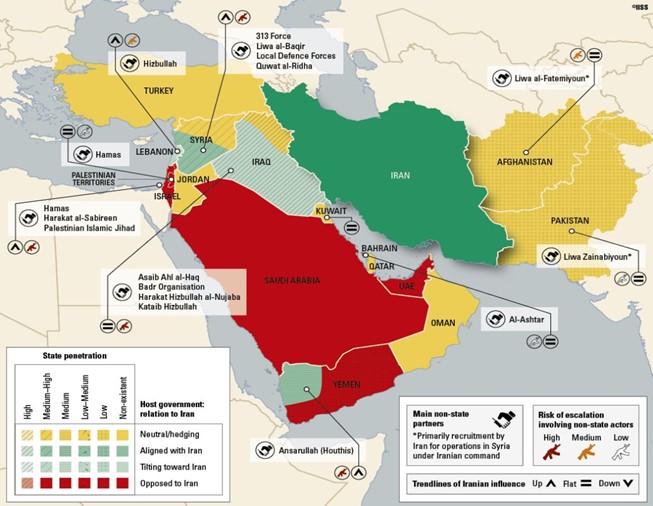 „Până în 2019, influența Iranului în Irak, Liban, Siria și Yemen devenise o nouă normalitate într-o regiune în care un astfel de concept ar fi fost cândva de neimaginat pentru liderii regiunii, inclusiv cei de la Teheran”, consemnează un raport al IISS[18]. „Iranul a realizat o mare parte din această schimbare folosind un militantism șiit transnațional, capabil să lupte angajând diferite grade de îndemânare și disciplină și care s-a confruntat simultan cu diferiți adversari ai Iranului, în diverse teatre de operațiuni militare.”